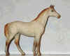 The Swaps (G1) mold is essentially the same mold as the Classic scale Swaps save for in size. The mold has the "Breyer Molding Co. � 1975" mold stamp on its belly, and some also have the "B" stamp. Early models have a space between the tail and body, while later models have a filled-in tail as seen above in the center photo. This space was re-added in about 2004 with a more rounded space between the tail and body. Swaps was sculpted by Maureen Love, originally for Hagen-Renaker, and is Breyer mold #5021.